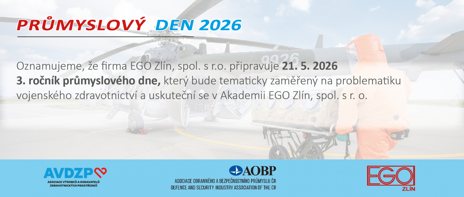 Dne 21. 5. 2026 se v Akademi firmy EGO Zlín, spol. s r.o. uskuteční 3. ročník „Průmyslového dne – vojenské zdravotnictví“.